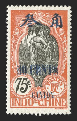 24 og Yvert #79a ImageYvert #79a, 1919 "30 CENTS" Surcharge on 75c Vermilion and black, double surcharge, beautifully centered, o.g, l.h., extremely fine and rare; signed Calves twice (Scott #77 var.). (Image) €950