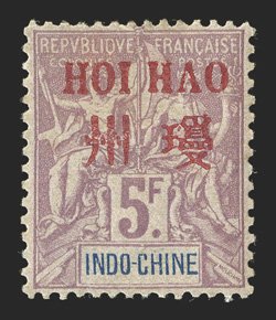 30 nh Yvert #49-65 vars. ImageYvert #49-65 vars., 1908 "Hoi-Hao" Bilingual overprint on 1c-10Fr. definitives, perforated 11, rare complete set of these trial perforations, o.g., n.h., 2c torn, otherwise fine-very fine; unlisted in Yvert and only the 1Fr., 2Fr. and 5Fr. values are listed in Maury at €200 or €225 apiece; 10Fr. accompanied by 2000 Behr certificate (Scott #49-66 vars.). (Image) Est. $500-750
