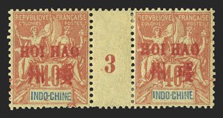 26 og Yvert #11 ImageYvert #11, 1901 "HOI HAO" Bilingual overprint on 40c Red on straw, horizontal gutter pair with millesimes "3", fresh and well centered, o.g., a few perf. separations reinforced with small h.r., very fine and rare; only 78 examples are possible (Scott #11). (Image) Maury €550