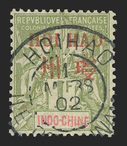 27 O Yvert #14 ImageYvert #14, 1901 "HOI HAO" Bilingual overprint on 1Fr. Bronze green and straw, scarce used example, neat 1 March 1902 Hoi Hao datestamp, very fine; only 600 stamps were overprinted; signed A. Brun (Scott #14; $740.00). (Image) €870