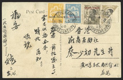 34 c   Image1928 Picture post card to Hong Kong, real photo of street scene post card franked by 1/5c and two different 2/5c (Yvert #74-75, 54), plus diagonally bisected Indochina 2c Yellow brown and black (#98) tied by two strikes of "Tchekam/Kouangtcheowan/26-5, 28" datestamps, Hong Kong arrival backstamp, very fine and unusual usage; signed Roumet. (Image) Est. $150-200