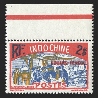 35 nh Yvert #96a ImageYvert #96a, 1927 "Kouang-Tcheou" Overprint on 2pi Red and deep blue, double overprint, post office fresh top sheet-margin single, o.g., n.h., very fine; signed A. Brun twice and Roumet (Scott 98a; $160.00 for hinged). (Image) Maury €275
