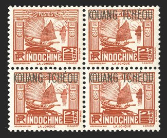 36 nhbl Yvert #99 var. ImageYvert #99 var., 1937 "KOUANG-TCHEOU" Overprint on 2/5c Orange red, omitted overprint, mint block of four, the top left stamp the error, pristine o.g., n.h., extremely fine and rare; not listed in either Yvert or Maury (Scott #101 var.). (Image) Est. $300-400