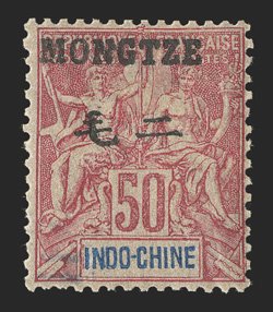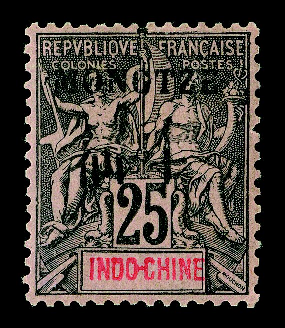 40 og Yvert #9 ImageYvert #9, 1903 "MONGTZE" Bilingual overprint on 25c Black on rose, right gutter margin single with millesimes "5" which is not listed by Maury, o.g., h.r., small thin in the gutter only, very fine and rare (Scott #7C; $725.00+). (Image) €840+