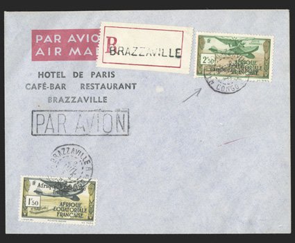 382 c Yvert #PA15a ImageYvert #PA15a, 1940 "Afrique Francaise/Libre" overprint on 2.50Fr. Green and buff, inverted overprint, error single tied along with 1.50Fr. Olive black and yellow (#14) to registered unaddressed cover by "Brazzaville, Congo/2 JUIL 42" datestamps, extremely fine (Scott #C9, C10b; $480.00 for used). (Image) for used €595