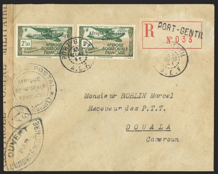 383 c Yvert #PA15a ImageYvert #PA15a, 1940 "Afrique Francaise/Libre" overprint on 2.50Fr. Green and buff, inverted overprint, error single tied along with a normal stamp to registered cover to Douala, Cameroun by "Port-Gentil, A.E.F./13 MARS, 41" datestamp, military censor tape at left tied by two censor handstamps on front and back, Douala backstamp, very fine (Scott #C10b; $240.00 for used). (Image) for used €330