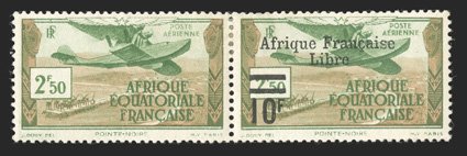 384 og Yvert #PA20 var. ImageYvert #PA20 var., 1941 "10F" Surcharge and "Afrique Francaise/Libre" overprint on 2.50Fr. Green and buff, omitted surcharge and overprint in pair with normal, horizontal pair, the left stamp the error, o.g., h.r., very fine; a very rare error as only ten such pairs were discovered; signed A. Diena, Roumet and others (Scott #C16 var.). (Image) Est. $750-1,000