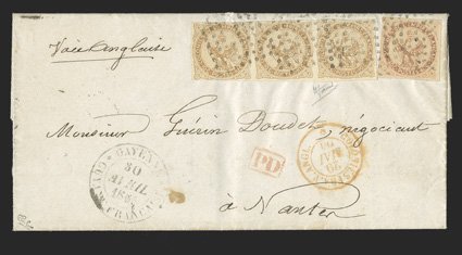 385 c   ImageFrench Colonies Yvert #3, 5, 1859 10c Bister on yellowish and 40c Orange on yellowish, former a horizontal strip of three, with mostly large margins to just touching at top left and a single of latter with large margins all around, all tied by lozenge cancels to fresh 1864 folded letter to Nantes, France, clear "Cayenne, Guyane Francaise/30 AVRIL 1864" double circle datestamp, "Voie Anglaise" directive, orange "Colonies Fra. V. Angl./20 MAI, 64" entry postmark and red boxed "PD", Paris and Nantes backstamps, very fine and rare usage from this colony; signed Calves and Jamet (Scott #3, 5). (Image) Est. $400-500