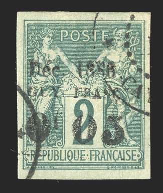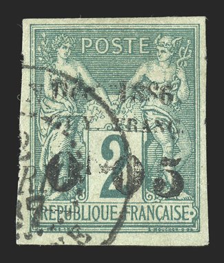 392 ng Yvert #3a ImageYvert #3a, 1887 "Avril 1887./GUY. FRANC./0f05" Surcharge on 2c Green on greenish, double surcharge, without gum as usual, four large to very large margins, rich color on fresh white paper, extremely fine; signed Bernichon and O. Roumet (Scott #5a; $750.00). (Image) €950