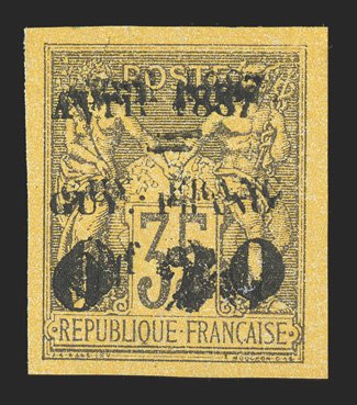 393 ng Yvert #4b ImageYvert #4b, 1887 "Avril 1887./GUY. FRANC./0f20" Surcharge on 35c Black on orange, double surcharge, without gum as usual, an especially choice mint single, showing both surcharges bold, large margins all around, rich color on fresh white paper, extremely fine; signed A. Brun twice (Scott #6a; $1,050.00). (Image) €1,300