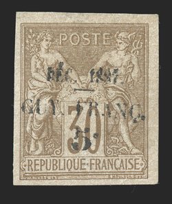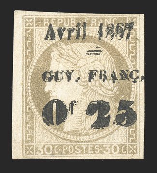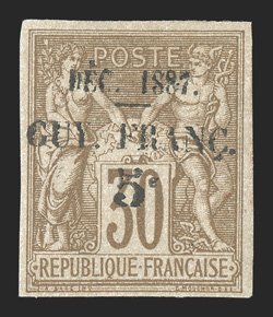394 ng Yvert #5a ImageYvert #5a, 1887 "Avril 1887./GUY. FRANC./0f25" Surcharge on 30c Brown on yellowish, double surcharge, without gum as usual, both surcharges bold, four clear to huge margins, fresh and nearly very fine; signed Calves twice and Richter (Scott #7a; $750.00). (Image) €950