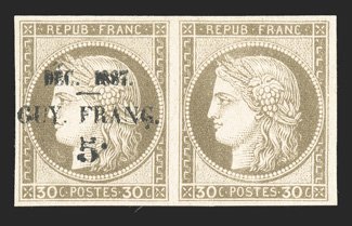 396 ng Yvert #6c ImageYvert #6c, 1887 "Dec. 1887./GUY. FRANC./5c" Surcharge on 30c Brown on yellowish, pair, one without surcharge, without gum as usual, horizontal pair, the right stamp with surcharge omitted, wonderfully fresh, large margins all around, very fine and choice; a rare and striking error; signed Calves and accompanied by 2001 Calves and 2000 Behr certificates (Scott #8c; $1,600.00). (Image) €1,800
