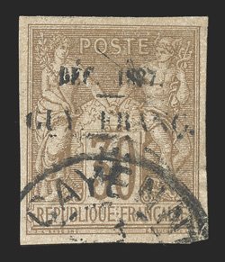 400 O Yvert #7 ImageYvert #7, 1887 "Dec. 1887./GUY. FRANC./5c" Surcharge on 30c Brown on yellowish, an elusive used example of this scarce stamp, generous margins all around, neat Cayenne postmark, couple small creases, otherwise very fine; only about 300 stamps were surcharged; signed Marquelet (Scott #9; $1,450.00). (Image) €1,700