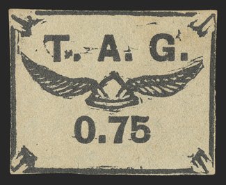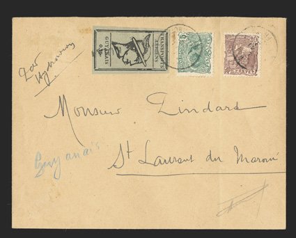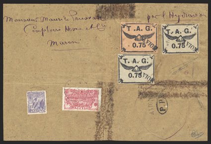 421 p Yvert #PA3, 4A ImageYvert #PA3, 4A, 1921 75c Black on salmon and 75c Black on greyish, single of former and two singles of latter, all with ample margins all around and cancelled by straightline "AVION" company handstamp on large portion of parcel wrapper to St. Laurent du Maroni, additionally franked by 1905 50c violet and 1Fr. Rose (#61, 63) tied by indistinct postmarks probably from Cayenne, additional "AVION" and "P P" in oval handstamps at lower right, front with horizontal and vertical folds reinforced with tape leaving staining, the tape having been removed and replaced with hinges, the staining not affecting the T.A.G. adhesives, otherwise very fine; a spectacular and likely unique high value parcel post franking by three T.A.G. stamps; signed Calves and accompanied by his 1993 certificate; cataloged simply as three used singles (Scott #CL3, CL5; $2,350.00 for used singles). (Image) €2,900