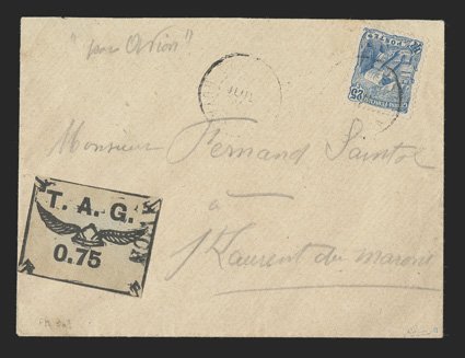 425 c Yvert #PA4A ImageYvert #PA4A, 1921 75c Black on greyish, cancelled by "AVION" woodblock company cancel on cover to St. Laurent du Maroni, additionally franked with 1905 25c Blue (#56) tied by faint Cayenne datestamp which is repeated to left, "por Orion" directive, very fine and scarce; signed Calves and on reverse by Octave Bellevue, an official with Comptoirs Hesse et Cie of Cayenne and by F. Rambaud, a director of T.A.G. and accompanied by 1991 Calves certificate (Scott #CL3; $1,500.00). (Image) Maury €1,850