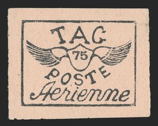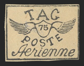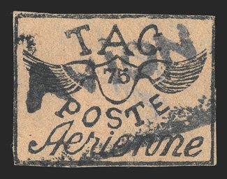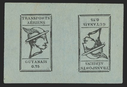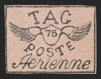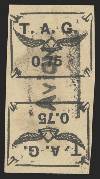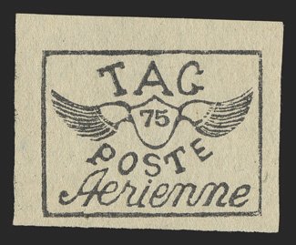 426 O Yvert #PA4Aa ImageYvert #PA4Aa, 1921 75c Black on greyish, tete-beche, an incredibly rare vertical pair, cancelled by a complete strike of "Avion" woodblock company cancel, mostly large margins to well clear at upper left, strong impression, reverse with some staining from adhesive not noted on the certificate, very fine; a great rarity of the T.A.G. issues; signed Behr and A. Brun and accompanied by clear 2006 Roumet certificate (Scott #CL3; $12,000.00). (Image) €14,000