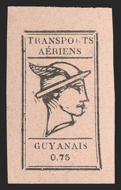 433 O Yvert #PA8 ImageYvert #PA8, 1921 75c Black on salmon, used with "Avion" woodcut company handstamp, margins clear to touching, fine and scarce; signed Calves and by Octave Bellevue, an official with Comptoirs Hesse et Cie of Cayenne (Scott #CL12; $1,200.00). (Image) €1,400