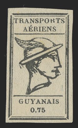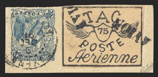423 O Yvert #PA4 ImageYvert #PA4, 1921 75c Black on bluish, used with "AVION" woodblock company cancel, ample to mostly large margins all around, strong impression on fresh paper, very fine and choice; only 500 stamps were printed; signed Rendon and by Octave Bellevue, an official with Comptoirs Hesse et Cie of Cayenne (Scott #CL4; $800.00). (Image) €900