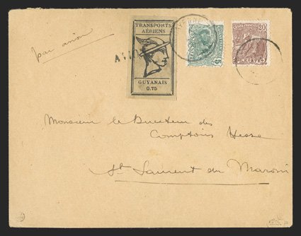 432 c Yvert #PA6A ImageYvert #PA6A, 1921 75c Black on greyish, large margins all around, tied by "AVION" straightline company handstamp to cover to St. Laurent du Maroni, additionally franked by 1905 5c Green and 20c Red brown (#52, 55) tied by two strikes of light Cayenne datestamp, one of which additionally tied the 75c stamp, "par avion" directive, fresh and extremely fine; a choice usage of this scarce stamp; signed Calves and accompanied by his 1991 certificate (Scott #CL6; $2,100.00). (Image) Maury €2,400