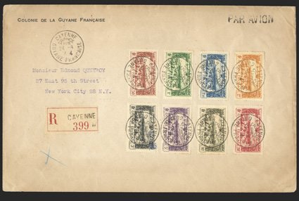 439 c Yvert #PA11-18 ImageYvert #PA11-18, 1933 50c-20Fr. View of Cayenne cplt., tied to large registered air mail cover to New York by separate strikes of "Cayenne France Libre/24-8, 44" datestamps, postmark repeated at upper left, registry etiquette, Miami transit backstamps and censor's handstamp, New York registry arrival backstamps, very fine and rare; Maury catalogs used off cover singles with the France Libre postmark for €30 each and a single on cover for €200 (Scott #C1-8). (Image) Est. $150-200