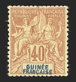 442 og Yvert #10a ImageYvert #10a, 1892 40c Red on straw, double inscription, well centered and fresh, o.g., small h.r., extremely fine; signed Roumet (Scott #13 var.). (Image) €500