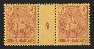 443 og Yvert #18-31 ImageYvert #18-31, 1904 1c-2Fr. Fulah shepherd, horizontal gutter pairs with millesimes "4", the 1c-20c in top gutter margin blocks of four and the 25c-2Fr. in pairs, all wonderfully fresh, with strong and intact perforations, o.g., 1c-20c l.h., others light h.r., 15c and 40c with stained spots, otherwise fine-very fine; very scarce and seldom offered (Scott #18-31). (Image) Maury €5,359