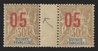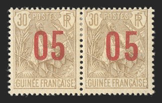444 og Yvert #52, 52A ImageYvert #52, 52A, 1912 "05" Surcharge on 30c Brown on bister, wide and narrow settings, horizontal pair with vertical gutter, the left stamp with wide spacing and the right stamp with narrow spacing, fresh and intact, o.g., very lightly hinged in the gutter only, the stamps n.h., very fine and scarce; signed Calves (Scott #52, 52a; $629.75 for hinged). (Image) for hinged €776+