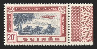 446 nh Maury #PA15b-16b ImageMaury #PA15b-16b, 1942 10Fr. Violet and ultramarine and 20Fr. Carmine and grey blue, double impression of centers, right sheet-margin singles, pristine o.g., n.h., very fine (Scott #C11-12 vars.). (Image) €1,100