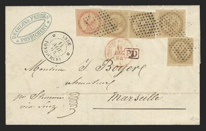 447 c   Image1864 Cover from Pondichery to Marseille, fresh folded letter franked by French Colonies 1859 10c Bister on yellowish horizontal pair, with one stamp sideways (Yvert #3a), mostly large margins to close at top left, plus two single 10c stamps and a 40c Orange on yellowish (Yvert #3, 5), all tied to each other and to cover by four strikes of mute lozenge, bold "Pondichery, Inde/11 Nov. 64" postmark alongside, "pr Steamer via Suez" directive, red "Colonies Francaise, 1/11 Dec 64" entry postmark and red boxed "PD", Marseille backstamp, extremely fine and handsome; a spectacular franking from India with the 10c "timbre couche", signed Calves (Scott #3, 3a, 5). (Image) Est. $1,000-1,500