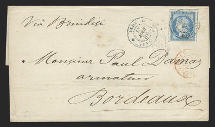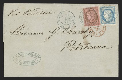 448 c   Image1878 Cover from Pondichery to Bordeaux, fresh folded letter franked by French Colonies 1873 25c Blue on bluish and 1876 10c Bister on rose (Yvert #23, 18), both with ample to mostly large margins all around, tied by two strikes of "Pondichery, Inde/10 Oct. 78" datestamp, "Via Brindisi" directive, red "Col. Fr. V. Brindsi/A. Mod/31 Oct 78" postmark also tying the stamps, Bordeaux backstamp, extremely fine (Scott #12, 20). (Image) Est. $200-300