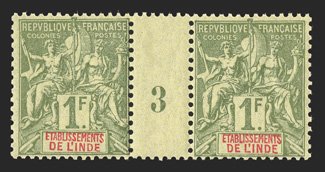 451 nh Yvert #12-13 ImageYvert #12-13, 1892 75c Deep violet on orange and 1Fr. Bronze green on straw, horizontal gutter pairs with millesimes "3", fresh and intact, o.g., n.h., fine-very fine (Scott #18-19 vars.). (Image) Maury €425