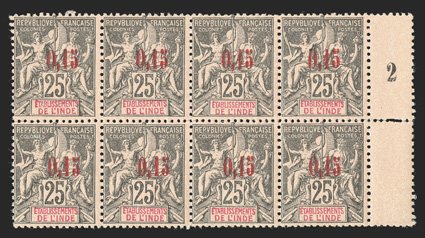 453 nhbl Yvert #22 ImageYvert #22, 1903 "0,15" Surcharge on 25c Black on rose, impressive right gutter-margin block of eight (4x2) with millesimes "2", exceptionally fresh, unblemished o.g., n.h., some perf. separations, fine (Scott #22; $1,800.00). (Image) Maury €2,200
