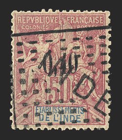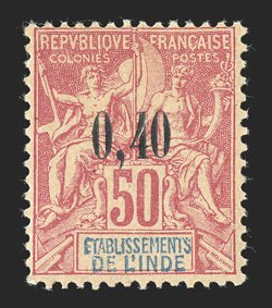 455 O Yvert #23 ImageYvert #23, 1903 "0,40" Surcharge on 50c Carmine on rose, scarce used example cancelled by "INDE" in box of dashes postmark, well centered, very fine; signed Calves (Scott #23; $400.00). (Image) €470