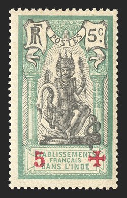 458 og Maury #45D-45Dc ImageMaury #45D-45Dc, 1916 Unissued black "+5" Surcharge on 5c Blue green and black, normal, double, inverted and double inverted surcharges, tropical o.g. as usual, fine-very fine and scarce (Scott unlisted). (Image) €1,580