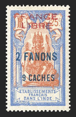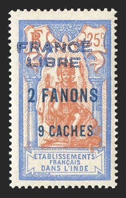 460 og Yvert #131a ImageYvert #131a, 1941 Carmine "FRANCE/LIBRE" two-line surcharge on "2 FANONS/9 CACHES" on 25c Ultramarine and fawn, choice mint example of this elusive stamp, near perfect centering and remarkably fresh, o.g., very lightly hinged, extremely fine; signed Calves and Roumet (Scott #116b; $2,000.00). (Image) €2,400