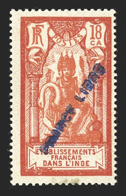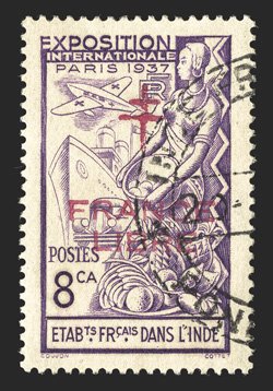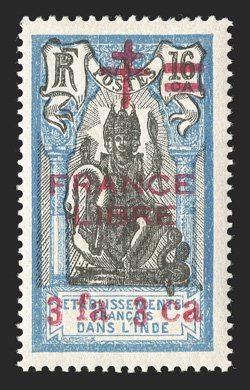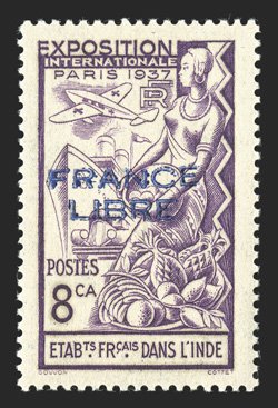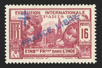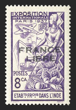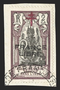 477 O Yvert #183a ImageYvert #183a, 1942 "FRANCE/LIBRE" Carmine overprint on 8ca Paris Exhibition, used with neat Pondichery datestamp, extremely fine and scarce; signed Calves (Scott #177 var.). (Image) €770