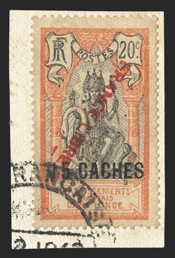476 p Yvert #177b ImageYvert #177b, 1942 "FRANCE/LIBRE" Black overprint on 2c Violet brown and black, tied to small piece by neat Pondichery c.d.s., extremely fine (Scott #157a; $175.00). (Image) €410