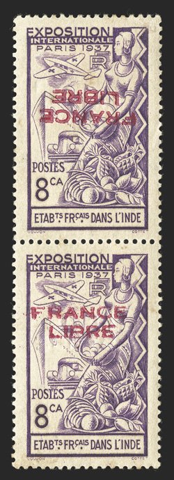 468 og/nh Yvert #156 var. ImageYvert #156 var., 1941 "FRANCE/LIBRE" Carmine overprint on 8ca Paris Exhibition, overprints double, one albino and inverted overprints, vertical tete-beche pair, the top stamp with inverted overprint and albino upright overprint and the bottom stamp with normal overprint and inverted albino overprint, o.g., small h.r., bottom stamp n.h., very fine and quite unusual; both signed Calves (Scott #135 var.). (Image) Est. $300-400