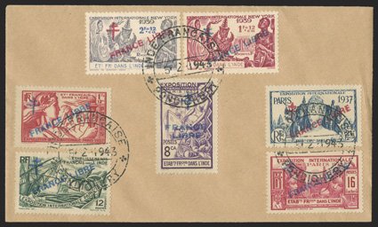 469 c Yvert #156a, 171-76 ImageYvert #156a, 171-76, 1941 "FRANCE LIBRE" Overprint in blue on 8ca Violet and on 12ca-2fa12ca Paris Exhibition and 1fa12ca-2fa12ca New York World's Fair, all tied to unaddressed cover by three strikes of 1943 Pondichery datestamp, extremely fine and rare (Scott #135A, 177-183; $1,583.50 for used). (Image) for used €1,823