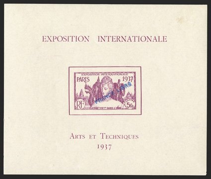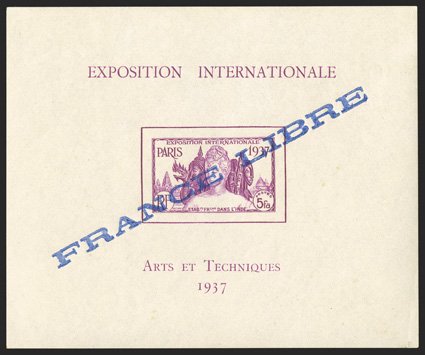 472 og Yvert #BF3 ImageYvert #BF3, 1943 "FRANCE LIBRE" Ty. "e" overprint on 5fa Colonial Arts Exhibition souvenir sheet, exceptionally fresh, o.g., tiny trace of hinging, very fine; only 495 copies were overprinted (Scott #140a; $875.00). (Image) €1,000