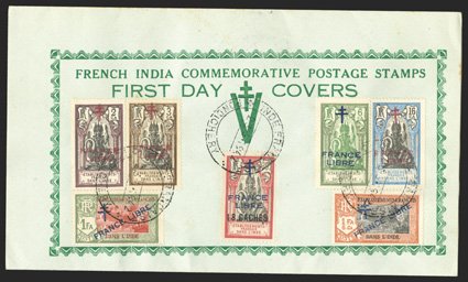 473 FDC Yvert #159, 162a ImageYvert #159, 162a, 1942 "FRANCE/LIBRE" Overprint on 18ca on 30ca Rose and black and blue overprint on 1fa6ca Orange on black, both used along with five other values (#161, 177-78, 179b, 180) on printed first day cover cancelled by 23.6.1942 Pondichery datestamp, addressed on reverse to Bombay, fresh and extremely fine (Scott #156a, 166 var.). (Image) for used €519