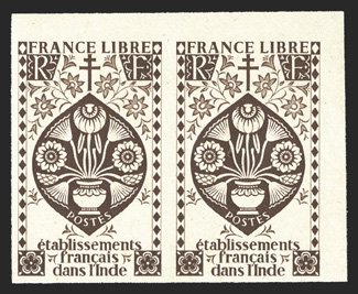 479 P Yvert #217P-30P ImageYvert #217P-30P, 1942 2ca-5Fr Free French Lotus Flower, plate proofs on stamp paper cplt., horizontal pairs, the 3R value without denomination, o.g., n.h., usual Waterlow archival creases, otherwise very fine; only 25 sets of pairs exist; ex-Waterlow Archives (Scott #143P-56P). (Image) Est. $300-400
