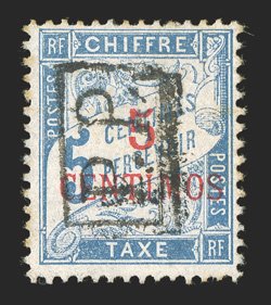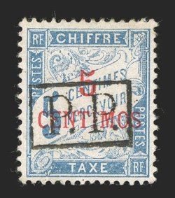 501 O Yvert #18 var. ImageYvert #18 var., 1903 5c on 5c Blue postage due, with boxed "P.P." vertically, double overprint, used (without gum), strong color, barest trace of perf. tip toning, otherwise a fine example of this rare error; signed A. Brun, Calves and accompanied by a clear 2004 Roumet certificate (Scott #18 var., Maury #21b). (Image) Maury €2,850