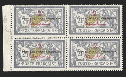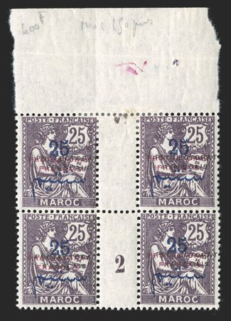 503 og/nhbl Yvert #45c ImageYvert #45c, 1914 25c on 25c Violet brown, with "PROTECTORAT/FRANCAIS" double overprint in red and black, top margin gutter block of four, with the bottom pair being a "2" millesimes, deep intense color, o.g., top pair with h.r., minor thin and a small stain, however the important millesimes pair is never hinged and fine; a rare millesimes pair; signed Champion (Scott #46c). (Image) Est. $500-750