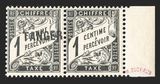 508 nh Yvert #TT35 var. ImageYvert #TT35 var., 1918 1c Black postage due, with "TANGER" omitted, right margin horizontal pair, the right stamp lacking the overprint, quite fresh, o.g., n.h., fine; this error was caused by the overprint being shifted to the left on the sheet, with it missing completely on the right column, Maury lists the shifted surcharge but not the omitted error; signed Calves (Scott #J35 var.). (Image) Est. $200-300