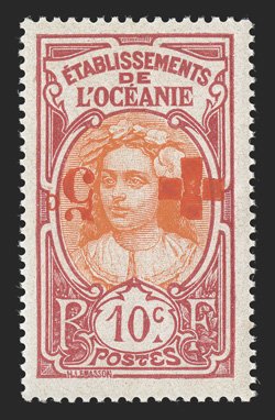 509 og Yvert #40a ImageYvert #40a, 1915 "+ 5c" Surcharge without bar under "c" on 10c Rose and orange, inverted surcharge, fresh and well centered, o.g., l.h., extremely fine; singed A. Brun (Scott #B3 var.). (Image) €375