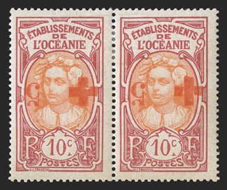 510 og Yvert #40a ImageYvert #40a, 40c var., 1915 "+ 5c" Surcharge without bar under "c" on 10c Rose and orange, inverted surcharge, horizontal pair, the right stamp with "e" instead of "c" after "5", o.g., light h.r., very fine and rare combination error pair (Scott #B3b, B3a var.). (Image) Est. $200-300
