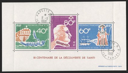514 O Yvert #BF1a ImageYvert #BF1a, 1968 Bicentennial of Discovery of Tahiti souvenir sheet, error "Bi-centenaire" hyphenated, cancelled by two strikes of "Papeete/Ile Tahiti/9-5, 1968" postmarks, folded along the perforations at the sides, otherwise very fine and rare (Scott #C47a var.). (Image) €1,300