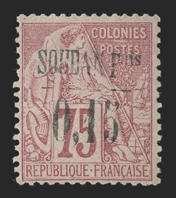 517 og Yvert #1 ImageYvert #1, 1894 "SOUDAN Fais/0,15" Surcharge on 75c Carmine on rose, a premium quality mint example of this terribly difficult and rare stamp, possessing a marvelous overall freshness which is quite uncharacteristic of this, plus its centering is far better than usually found, strong color, o.g. with only a tiny trace of hinging, very fine; while 1,000 stamps were surcharged most were used for postage and the small number of mint examples that remain are most often faulty and/or quite off center, which makes this one of the finest mint singles available; signed A. Brun and Calves and accompanied by 2001 Calves certificate (Scott #1; $4,500.00). (Image) €4,700