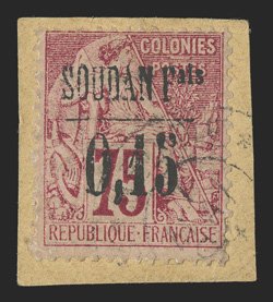 518 p Yvert #1 ImageYvert #1, 1894 "SOUDAN Fais/0,15" Surcharge on 75c Carmine on rose, tied to small piece by light 1894 c.d.s., deep rich color, fine and rare; signed Halgatte (Scott #1; $2,250.00). (Image) €2,400